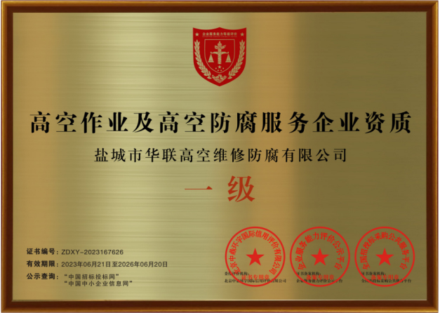 鹽城市華聯高空維修防腐有限公司始建于上世紀八十年代,系專業從事風力發電機塔筒防腐,塔筒維護,塔筒補漆,塔筒噴字等工程。不停產,不搭手架,高空懸吊施工的一級高空安全資質、一級高空防腐施工資質、二級建筑施工資質的高空建修、防腐工程、公司。現已發展集科研、設計、施工為一體的的江蘇省較大的高空建修,高空防腐施工企業;公司注冊資金3008萬元,流動資金8000多萬元;擁有高修技術科研高修工程設計、高修工程施工三大技術與施工組織體系;公司擁有一流的技術施工隊伍,其中有高級職稱36 名,中級職稱126人。具備一級防腐資質、一級安全資質及二級建筑資質,公司下轄五個分公司和十八個辦事處,為全國數百家企業解決了若干“高、大、難”的特殊工程項目,填補了我國建筑史上的空白。